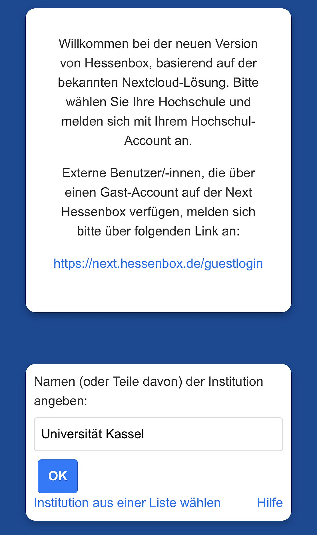 Sie können entweder "Universität Kassel" manuell eingeben oder sie tippen auf "Institution aus einer Liste wählen" und wählen dann die Universität Kassel aus.