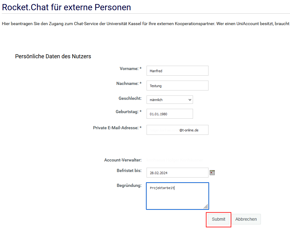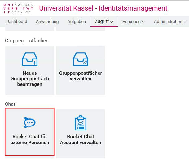 RocketChat Accounts für externe Personen ohne UniAccount (z.B. für externe Projektpartner) können Sie als Mitarbeitende der Universität Kassel über das Identitätsmanagement beantragen.