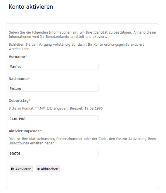 Geben Sie Ihre Daten sowie den zugesendeten Aktivierungscode ein und klicken Sie auf "Aktivieren".