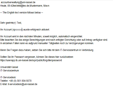 Ebenso eine Aufforderung diesen Account im Identitätsmanagement (IDM) mit dem Aktivierungscode <56xxxx> zu aktivieren. Während der Aktivierung legt der:ie Nutzende des neuen Sharepoint-Accounts das persönliche Passwort fest.