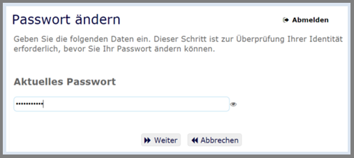 Es öffnet sich ein neues Fenster. Sie werden nach Ihrem "aktuellen Passwort" gefragt. Bitte geben Sie es ein und klicken auf "Weiter".