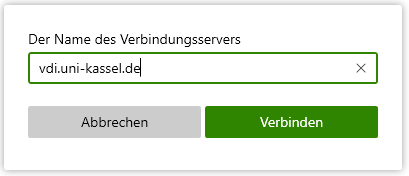Um sich nun mit der VDI der Uni Kassel zu verbinden, geben Sie als Verbindungsserver „vdi.uni-kassel.de“ ein.