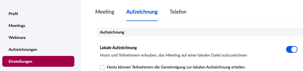- Aktivieren Sie in den persönlichen Einstellungen die Funktion zum Aufzeichnen. Diese finden Sie unter uni-kassel.zoom-x.de im Bereich Einstellungen ► Aufzeichnung (Menü oben) ► Lokale Aufzeichnung. Die weitere Option, Teilnehmern das Aufzeichnen zu erlauben, ist zu deaktivieren.