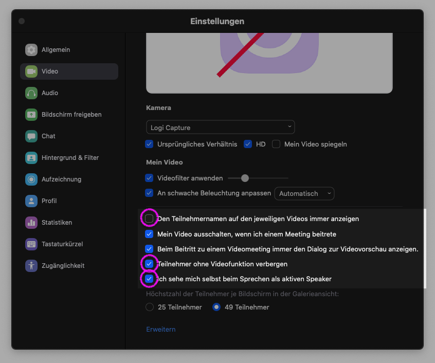 - Aktivieren Sie die Option, dass Teilnehmer ohne Videoübertragung ausgeblendet werden: