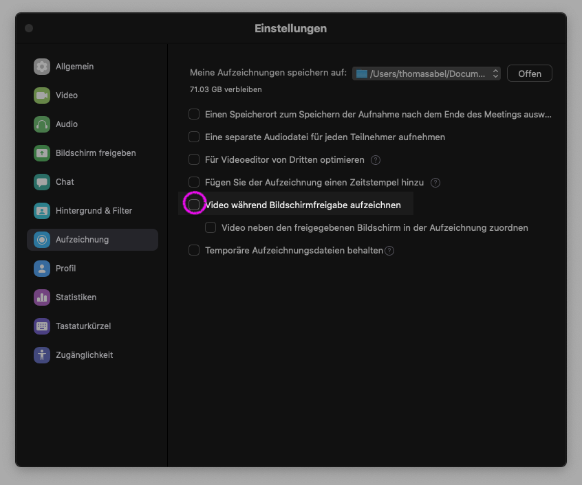 - Achten Sie darauf, dass Sie genügend freien Plattenplatz (ca. 1 GB pro Stunde Aufzeichnung) auf Ihrem System haben. Die Aufzeichnungen werden standardmäßig im Ordner „Dokumente“ im dortigen Unterverzeichnis „Zoom“ gespeichert.