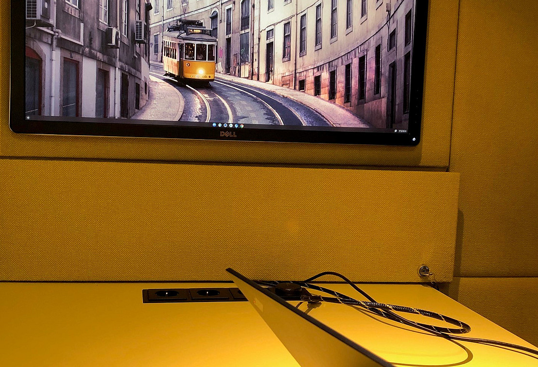 Bild: UB KasselAb Freitag, 15. Oktober steht der gelbe Lerncube in der Campusbibliothek in B/1 zum Testen des Wandmonitors bereit. Anschlüsse für HDMI und USB-C sind vorhanden. Bei einwandfreiem Betrieb werden die Monitore in allen vier Cubes zur Nutzung freigegeben. So funktioniert's: Monitor einschalten, eigenes Endgerät mit dem passenden Anschluss verbinden, dann erscheint die Bildschirmansicht auf dem Monitor.