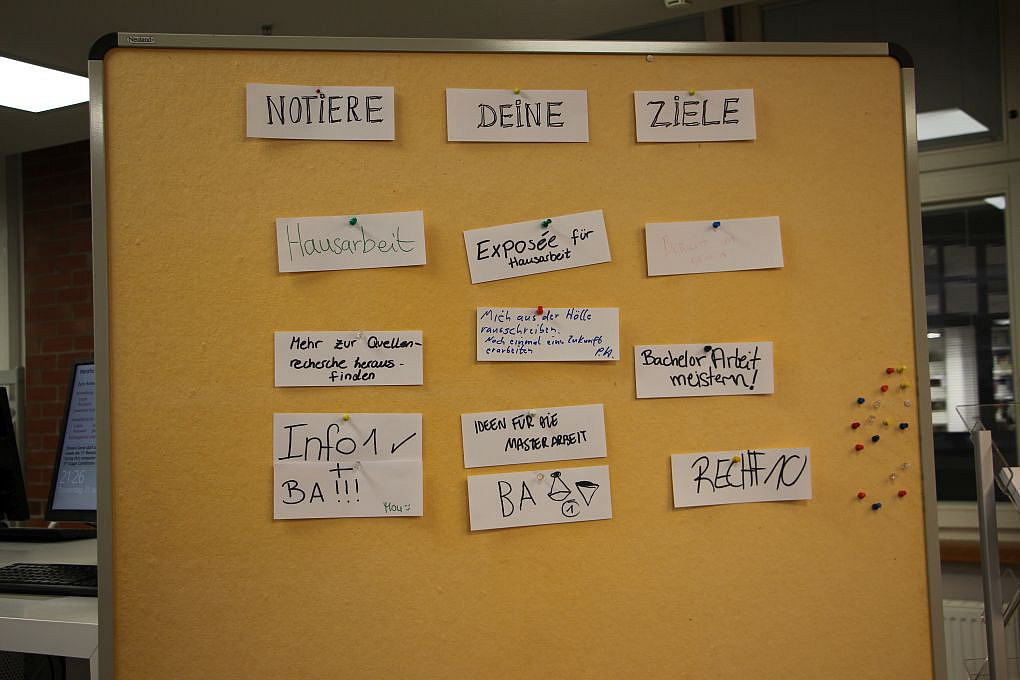 Auf einer digitalen Pinnwand konnten die Studierenden wählen zwischen Präsenzangeboten, Beratung und anderen hilfreichen Ergänzungen für längere Schreib- und Lernphasen. Neben den bereits angemeldeten Teilnehmer:innen entschieden sich zahlreiche Studierende am Abend ganz spontan, noch an der Veranstaltung teilzunehmen und die fröhlich-kreative Atmosphäre in der Bibliothek für sich zu nutzen.
