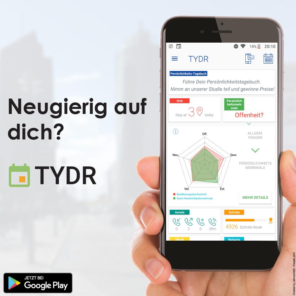Nach dem Ausfüllen von Fragebögen ist ein Persönlichkeitsprofil einsehbar. Derzeit wird eine Studie mit TYDR durchgeführt. Teilnehmende füllen für 21 Tage jeden Abend einen Multiple Choice Fragebogen aus.