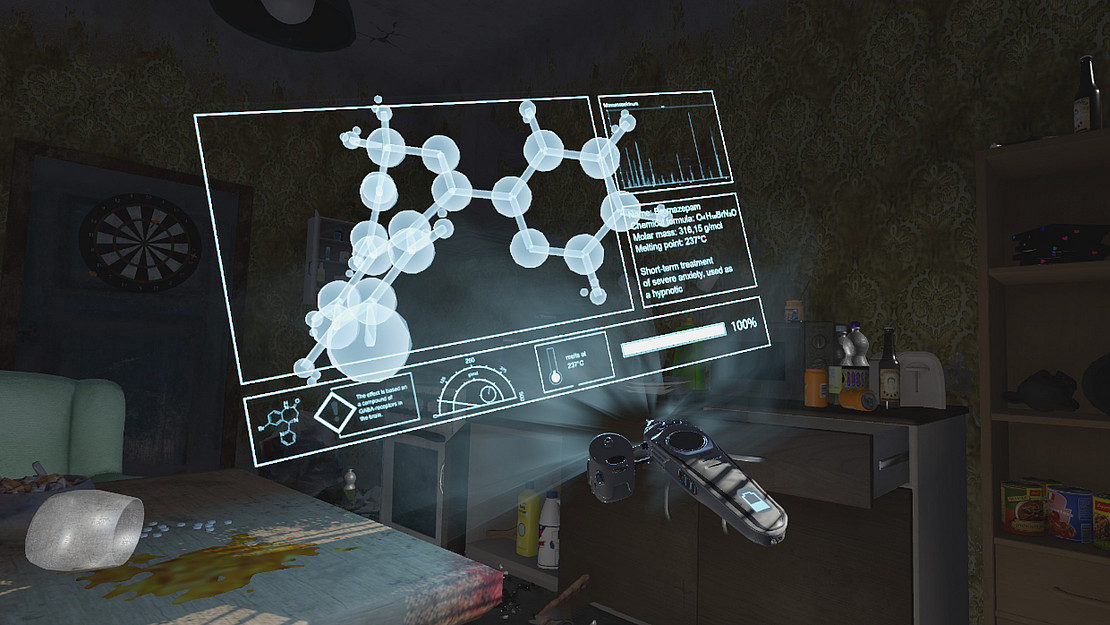 „Hello, my name is Mrs. Rothenstein.“ In meinem Blickfeld taucht plötzlich das Abbild einer Frau auf, die belehrend und mit britischem Akzent, Nickelbrille und strenger Frisur einen kurzen Einblick über das Spiel gibt. Sie erklärt die Nutzung der Controller. Mein Blick schwenkt zur Seite und der zuvor dunkelgraue Hintergrund verschwindet. Ich befinde mich mitten in einer Küche und stehe wortwörtlich im Tischbein. Links von mir die Küchenzeile, geradeaus Fenster und Heizung, rechts Küchentisch und Sofa. Die Leiche neben dem Küchentisch fällt mir erst jetzt auf. Ich bin also direkt in einen Tatort katapultiert worden. Mrs. Rothenstein (gespielt von Eva Keller) wird eingeblendet. Die Frage ist: Wie ist der Mann gestorben? Erst jetzt wird mir bewusst, wie ich die Umgebung komplett ausgeschaltet habe. Ich habe das Gefühl, dass ich in diesem Moment direkt in dieser Küche stehe.