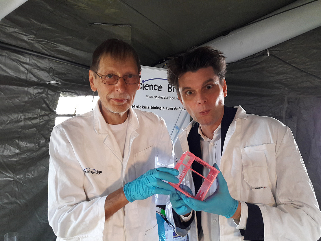 Science Bridge bot einen Vortrag, mehrere Laborkurse sowie ein Planspiel zur Frage, ob es ethisch vertretbar ist, zur Malaria-Bekämpfung Mücken-Populationen per Gene-Drive auszurotten. „Das Interesse der Teilnehmerinnen und Teilnehmer war bemerkenswert“, freut sich Kursleiterin Dr. Heike Ziegler, und ergänzt: „Zumal es in dem Zelt bei dem guten Wetter sehr warm wurde. Wer da vier Stunden mitmacht, ist wirklich sehr motiviert.“