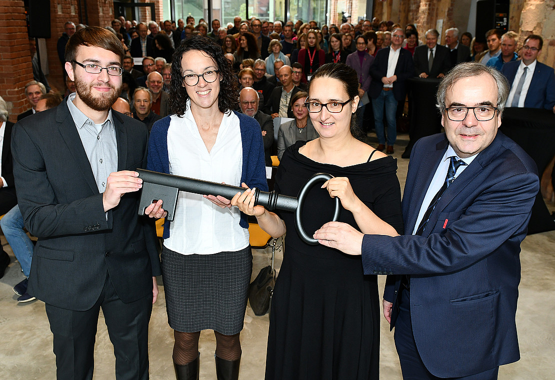 Bild: Harry Soremski für Uni Kassel. „Ich freue mich, dass wir unseren Studentinnen und Studenten heute ein echtes Schmuckstück übergeben können“, sagte Universitätspräsident Prof. Dr. Reiner Finkeldey während der Eröffnungsfeier. Das neue Studierendenhaus befindet sich in einem denkmalgeschützten Gebäudekomplex der ehemaligen Textilfabrik Gottschalk, den sogenannten Kopfbauten. Die Baumaßnahme hat rund 7,3 Mio Euro gekostet und wurde von Bund und Land Hessen mit Mitteln aus dem Hochschulpakt 2020 finanziert.