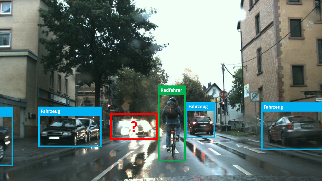 In dem Bild sieht man eine urbane Verkehrssituation, in der ein autonom fahrendes Fahrzeug hinter einem Radfahrer auf eine Kreuzung zufährt. Über die im Fahrzeug verbaute Kamera nimmt das autonome Fahrzeug seine Umgebung war. Die mittels maschineller Lernmethoden angelernte KI erkennt die Objekte im Kamerabild. Die von der KI erkannten Objekte sind farblich dargestellt. Das Wetter ist regnerisch und die Sicht ist dementsprechend schlecht. Auf Grund der schlechten Umgebungsbedingungen wird das entgegenkommende Fahrzeug nicht erkannt. Jedoch ist es zur Absicherung der automatisierten Fahrfunktionen notwendig, dass eine KI auch in solchen schwierigen und zumeist auch kritischen Situationen zuverlässig funktioniert. Im Rahmen des KI Data Tooling Projekts sollen Werkzeuge entwickelt werden, die solche kritischen und von der KI noch nicht gut abgedeckten Situationen automatisiert identifizieren können. Die so gezielt ausgewählten Situationen und Daten können für das weitere Anlernen der KI sowie zur Absicherung der KI Funktion verwendet werden.