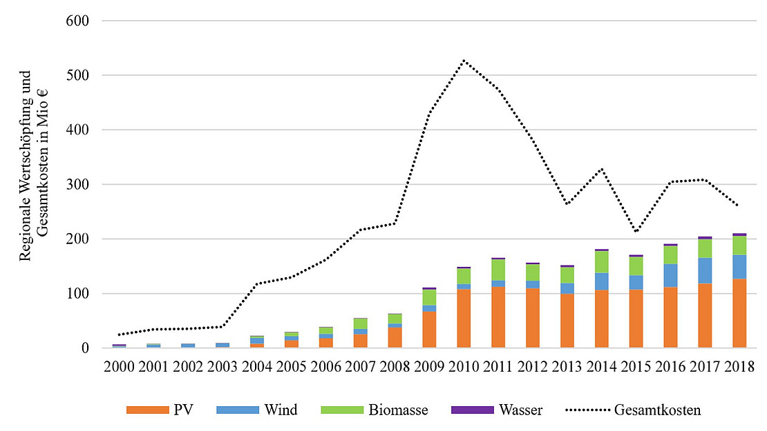 Was die regionale Wertschöpfung betrifft, entfällt der Löwenanteil auf die Photovoltaik - sie macht rund 61 Prozent der Wertschöpfung aus. Was die Forscher überrascht hat: Die Windkraft kommt erst an dritter Stelle, davor steht noch die Wertschöpfung aus Biomasse. „Da der Ausbau der Windkraft erst ab dem Jahr 2014 intensiver stattgefunden hat, konnten die Effekte nur für wenige Jahre in das Gesamtergebnis einfließen, hier sind für die kommenden Jahre steigende Beiträge zur regionalen Wertschöpfung zu erwarten“, führt Dr. Wilkens aus.