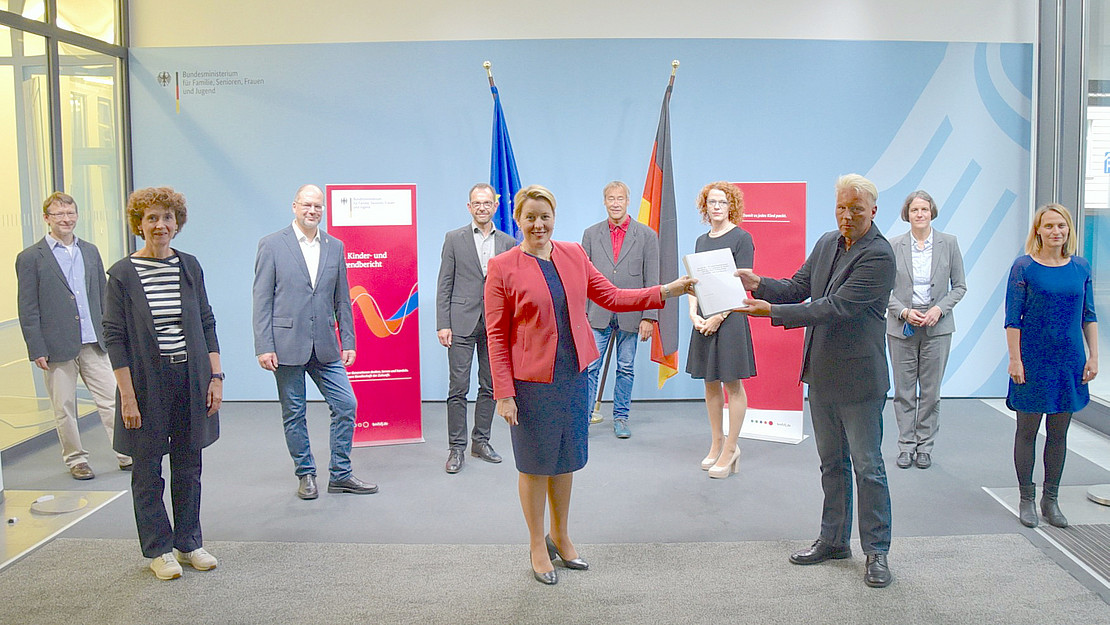 Ministerin Dr. Franziska Giffey nimmt den Bericht entgegen. Ganz links Prof. Dr. Andreas Eis.