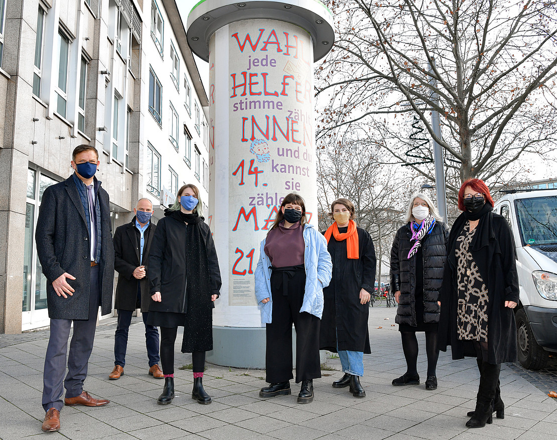 Bild: Harry Soremski/Stadt Kassel.Um Freiwillige zu gewinnen, haben die Studierenden Kathrin Maurer, Elisa Hempel und Valentina Voß des Fachbereichs Visuelle Kommunikation an der Kunsthochschule Kassel Plakate gestaltet, die seit 20. November an vielen Litfaßsäulen in der Stadt zu sehen sind. Möglich macht das die Firma Ströer, die der Stadt Kassel ihre Werbeflächen kostenlos zur Verfügung stellt. „Wir freuen uns sehr über die tolle Unterstützung der Kunsthochschule sowie der Firma Ströer“, dankt Bürgermeisterin Ilona Friedrich den Kooperationspartnern.