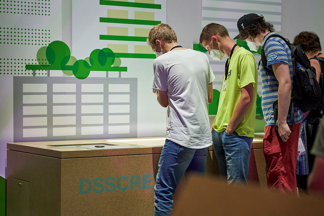 Bild: Björn Lauen/Bau Kunst ErfindenUnter dem Motto „Connecting Minds, Creating the Future” findet in Dubai noch bis zum 31. März 2022 die Weltausstellung Expo 2020 statt. Im deutschen Pavillon zeigt das transdisziplinäre Team mit dem Forschungsprojekt „DysCrete/DssCrete“ eine Methode, um den Baustoff Beton durch das Auftragen einer Schicht von photoreaktiven Substanzen leitfähig und zu einer stromproduzierenden Solarzelle zu machen. Im Gegensatz zu Sonnenkollektoren uf dem Dach ermöglicht diese in die Architektur integrierte Lösung große Freiheiten in der Gestaltung und somit eine qualitätvolle Architektur.