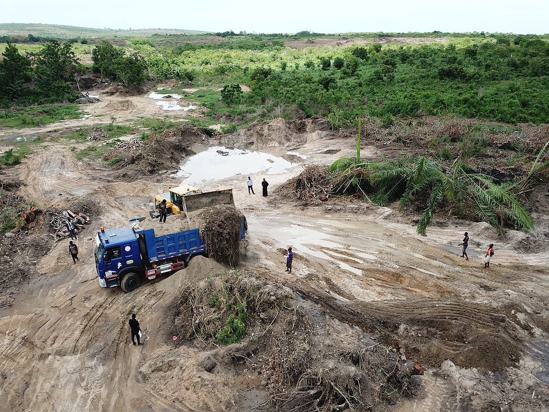 Abtransport von Sand mit schwerem Gerät in Ghana.
