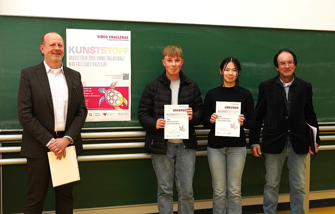 Den 1. Platz belegten Lina Jin (16) und Elias Volodin (16) mit ihrem Video „Plastik (un-)ersetzlich?“. Sie griffen lebensnah und auf kreative Weise die Themen Umweltbelastung durch Kunststoff, Vermeidungsstrategien und Recycling auf, verdeutlichten aber auch die Unersetzbarkeit des Werkstoffes am Beispiel des Fahrradhelms. Sie erhielten für ihren Beitrag einen besonderen Preis: eine Jugendreise nach Sri Lanka, um dort in einem Freiwilligen-Projekt dabei zu helfen, die Lebensgrundlagen von Schildkröten zu bewahren.
