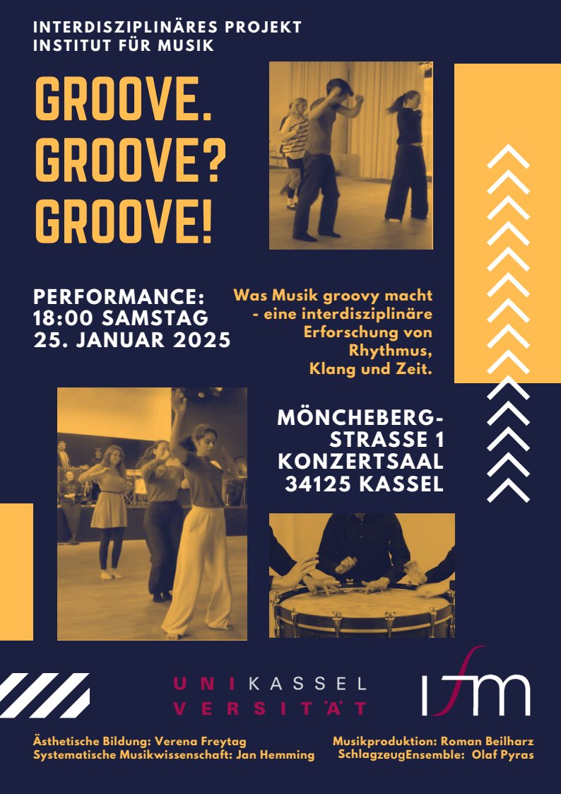 In einem interdisziplinären Projekt zum Thema „Groove“ haben wir uns im WS 24/25 gefragt, was an Musik eigentlich „groovy“ ist und wann sie uns mitreißt. Wir haben dazu eine gemeinsame Tanz- und Musikperformance mit extra dafür produzierten Tracks, Live-Drumming, Performance, Tanz und interaktiver, wissenschaftlicher Visualisierung entwickelt und lassen die Funken zum Publikum überspringen.