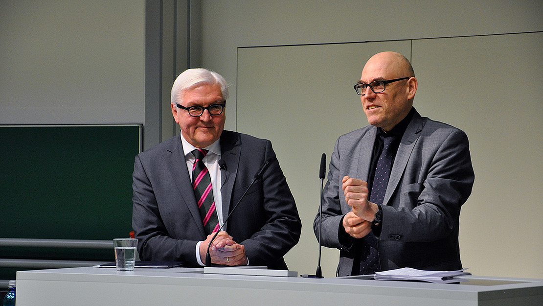 Bildunterschrift: Außenminister Frank-Walter Steinmeier (l.) und Prof. Dr. Wolfgang Schroeder,