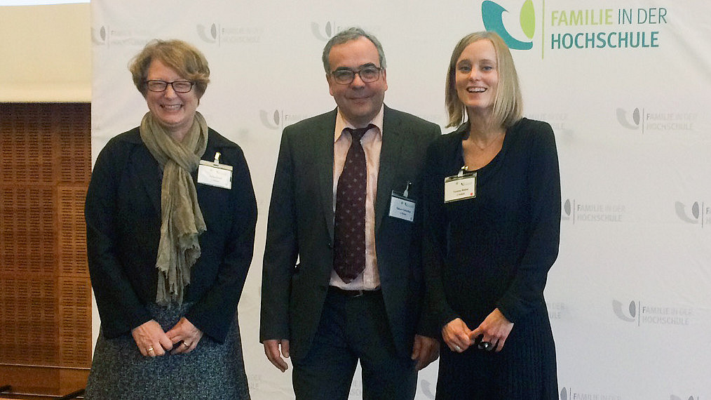 Bildunterschrift: Bei der Unterzeichnung der Charta „Familie in der Hochschule“ am 19. September in Berlin – von links: Dr. Sylke Ernst, Frauenbeauftragte der Universität Kassel, Prof. Dr. Reiner Finkeldey, Präsident der Universität Kassel, Yvonne Weber, Koordinatorin Family Welcome & Dual Career an der Universität Kassel.