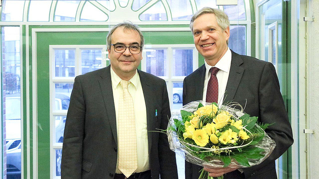 Zugleich dankte Finkeldey dem ausscheidenden Vize-Präsidenten Hänlein für sechs Jahre Arbeit im Präsidium: „Sie haben mit ihrer sachlichen, stets überlegten Art die Geschicke unserer Universität mit geprägt und sich insbesondere um die Weiterentwicklung der Studienqualität äußerst verdient gemacht. Darüber hinaus hat das gesamte Präsidium im vorvergangenen Jahr enorm von Ihrem Erfahrungswissen profitiert.“ 2015 waren mit Finkeldey selbst, Kanzler Dr. Oliver Fromm, Vize-Präsidentin Prof. Dr. Ute Clement und Vize-Präsident Prof. Dr. Arno Ehresmann vier von fünf Präsidiumsmitgliedern neu angetreten. „Sie werden uns fehlen – aber wir wissen Sie in der Nähe, wenn wir Ihren Rat brauchen.“ Hänlein (57) hatte sich nicht wieder zur Wahl gestellt, weil er sich in Zukunft auf Forschung und Lehre in seinem Fachgebiet Wirtschafts-, Arbeits- und Sozialrecht konzentrieren will.