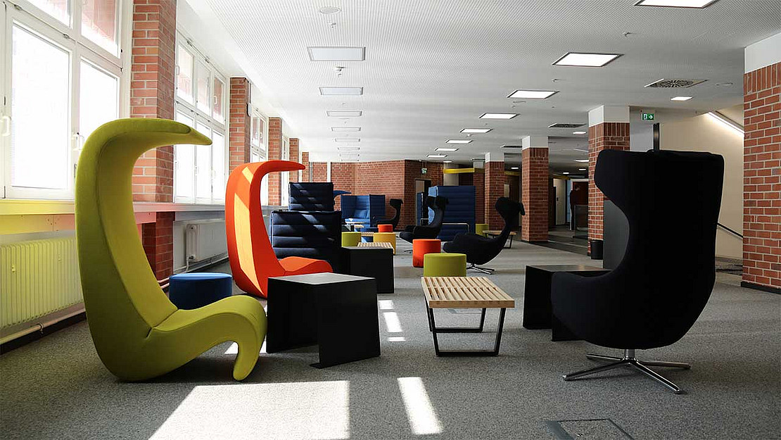 Bildunterschrift: Blick in den Lounge-Bereich der zentralen Trakts der Campus-Bibliothek.