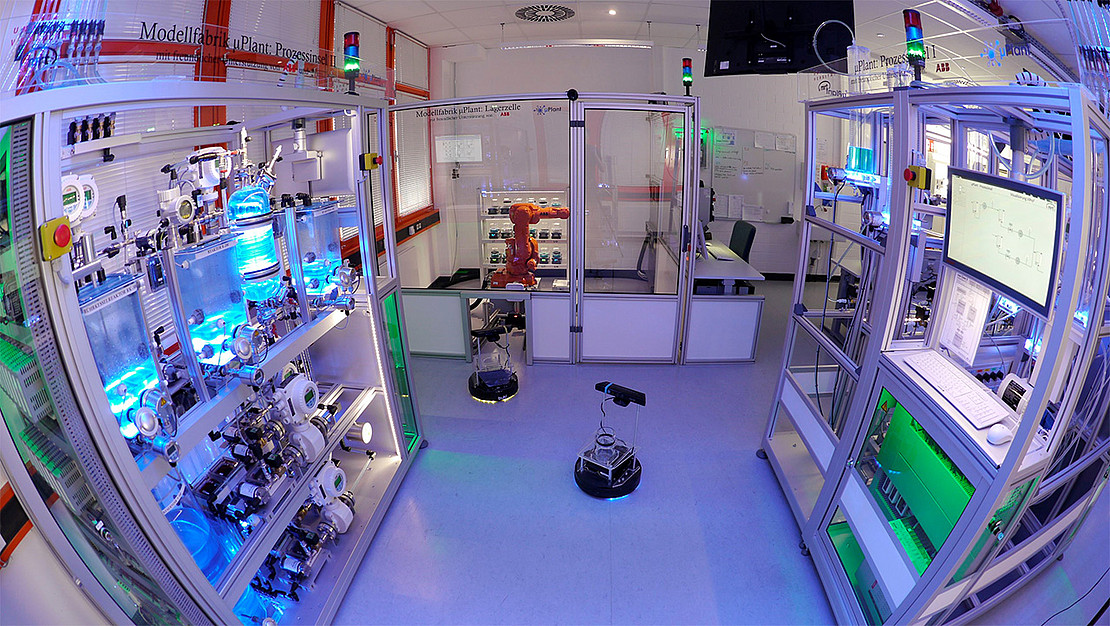 Die Anlage wurde seit 2011 aufgebaut, sukzessive in Betrieb genommen und Anfang 2017 offiziell eingeweiht. „Unser Anspruch ist es, den Studierenden eine Ausbildung an Gegenwarts- und Zukunftstechnologien zu bieten“, erklärte Prof. Dr.-Ing Andreas Kroll, Leiter des Fachgebiets Mess- und Regelungstechnik. Die Anerkennung durch Staatsminister Rhein sei für alle Beteiligten eine sehr motivierende Bestätigung. Die Modellfabrik „μPlant“ ist ein Projekt von Prof. Kroll, Johann Pankratz, Axel Dürrbaum, David Arengas, Hassan Al Mawla, Benjamin Jäschke und Dr.-Ing. Andreas Geiger.