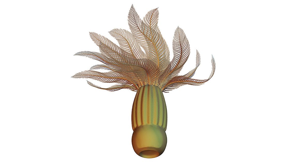Rekonstruktion des Federpolyps †Xianguangia sinica, eines ausgestorbenen Stammlinienvertreters der Nesseltiere (Quallen, Korallen & Co.). Copyright: Huanzhen Li & Qiang Ou: http://www.uni-kassel.de/uni/fileadmin/datas/uni/presse/anhaenge/2017/Fossil_Photo_Qiang_Ou_Huanzhen_Li.jpg