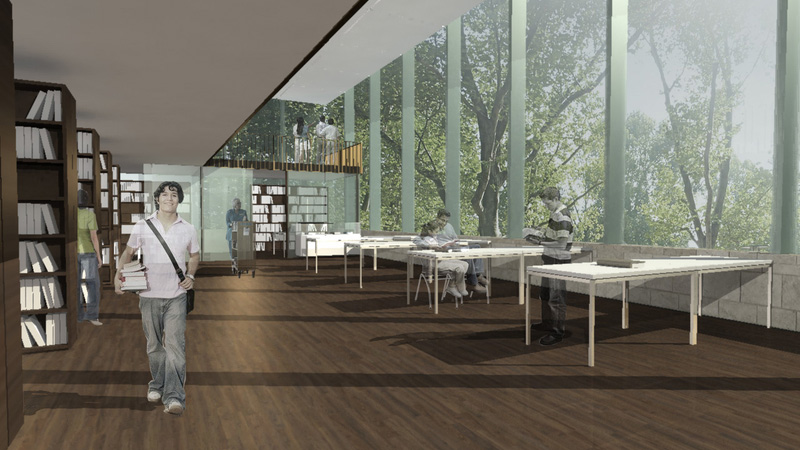Image: Sichau and Walter.Der denkmalgeschützte Altbau (Hauptnutzfläche 3600 m²) weist einen erheblichen Sanierungsstau auf. Er wird in den kommenden Jahren modernisiert, die Bautechnik wird erneuert. Auch der historische Eulensaal wird dann wieder für Konzerte und andere Kulturveranstaltungen zur Verfügung stehen. Ein vierstöckiger Anbau mit rund 680 m² Hauptnutzfläche erweitert das Gebäude künftig nach Nordwesten, dort befindet sich momentan ein Parkplatz. Im Anbau entstehen ein Magazin, aber auch ein verglaster zweistöckiger Lesesaal sowie ein Ausstellungsraum, um die wertvollen Handschriften und andere kulturelle Schätze gut geschützt präsentieren zu können.