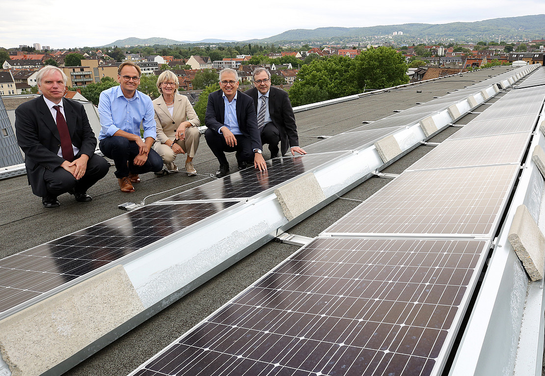 Image: Andreas Fischer for the University of Kassel.Al-Wazir besuchte die Photovoltaik (PV)-Anlage, die auf dem Dach des Fachbereichs Elektrotechnik/Informatik der Universität montiert ist, im Rahmen seiner Sommerreise. Sie geht in Kürze in Betrieb und ist die erste einer Reihe von Anlagen, die mit Unterstützung der Kasseler cdw Stiftung gGmbH in den kommenden Jahren auf Dächern der Universität errichtet werden. Die cdw Stiftung fördert das Vorhaben mit insgesamt 1 Mio. Euro. Die Universität wird den Strom selber nutzen; die Ersparnis bei den Stromkosten investiert die Hochschule in weitere PV-Anlagen und andere Nachhaltigkeitsprojekte. Im Endausbau sollen alle Anlagen zusammen etwa 600.000 Kilowattstunden Strom pro Jahr produzieren.