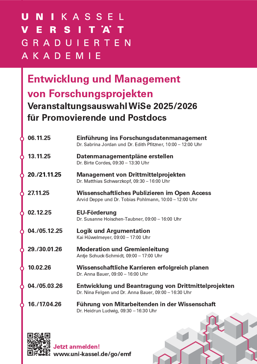 Participation is open to doctoral candidates and postdocs, as well as young artists who plan to submit an application for third-party funding in the near future. The programme is primarily open to members and affiliates of the University of Kassel and (associated) members of the Marburg University Research Academy (MARA). If spaces are available, external persons such as doctoral candidates and postdocs from other universities can participate at an increased registration fee.