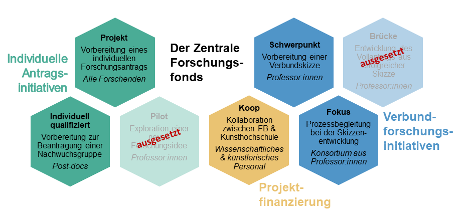 | Ziel | Die Förderlinie Koop soll die interdisziplinäre Zusammenarbeit zwischen den Fachbereichen und der Kunsthochschule vertiefen. |