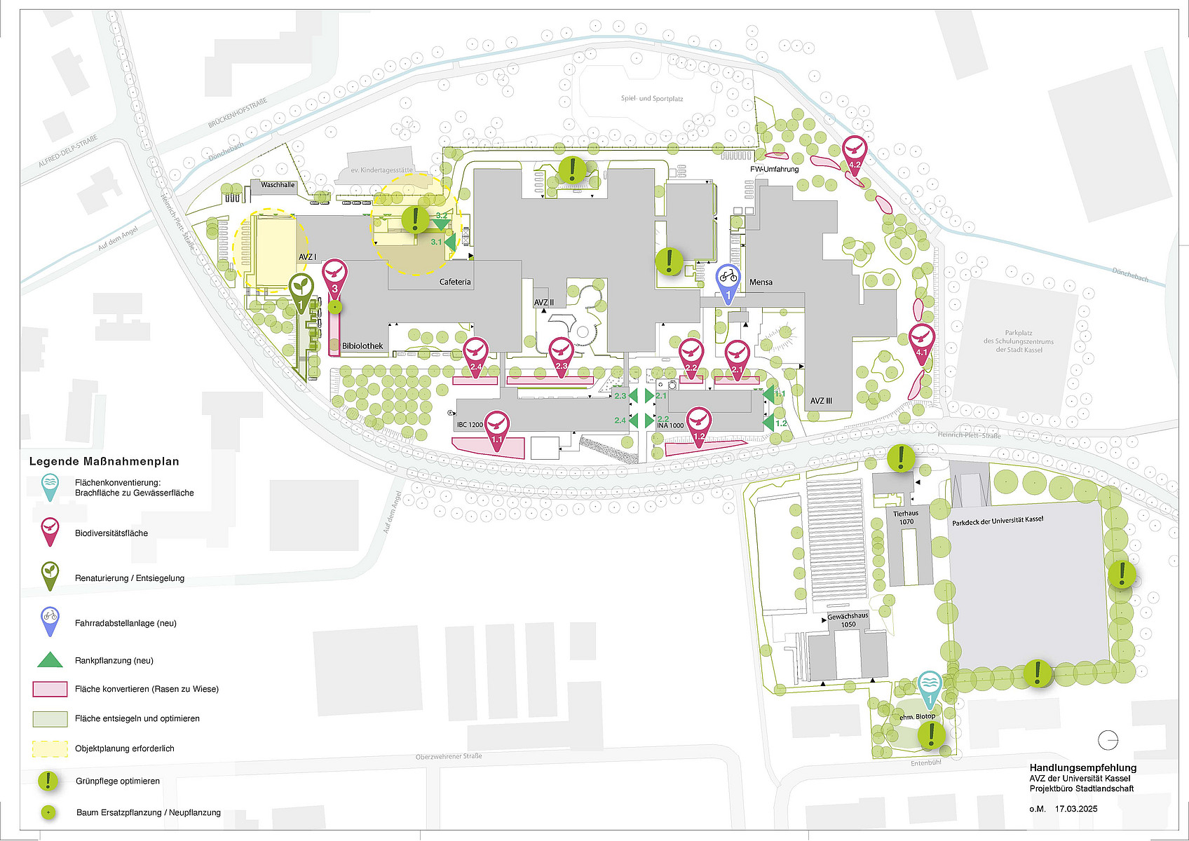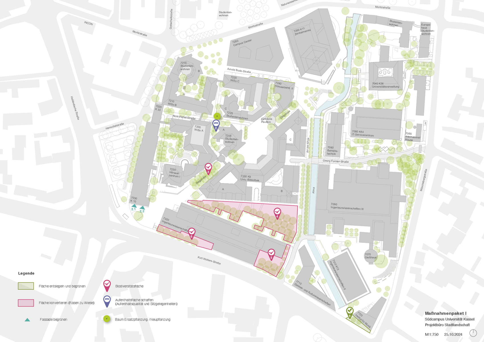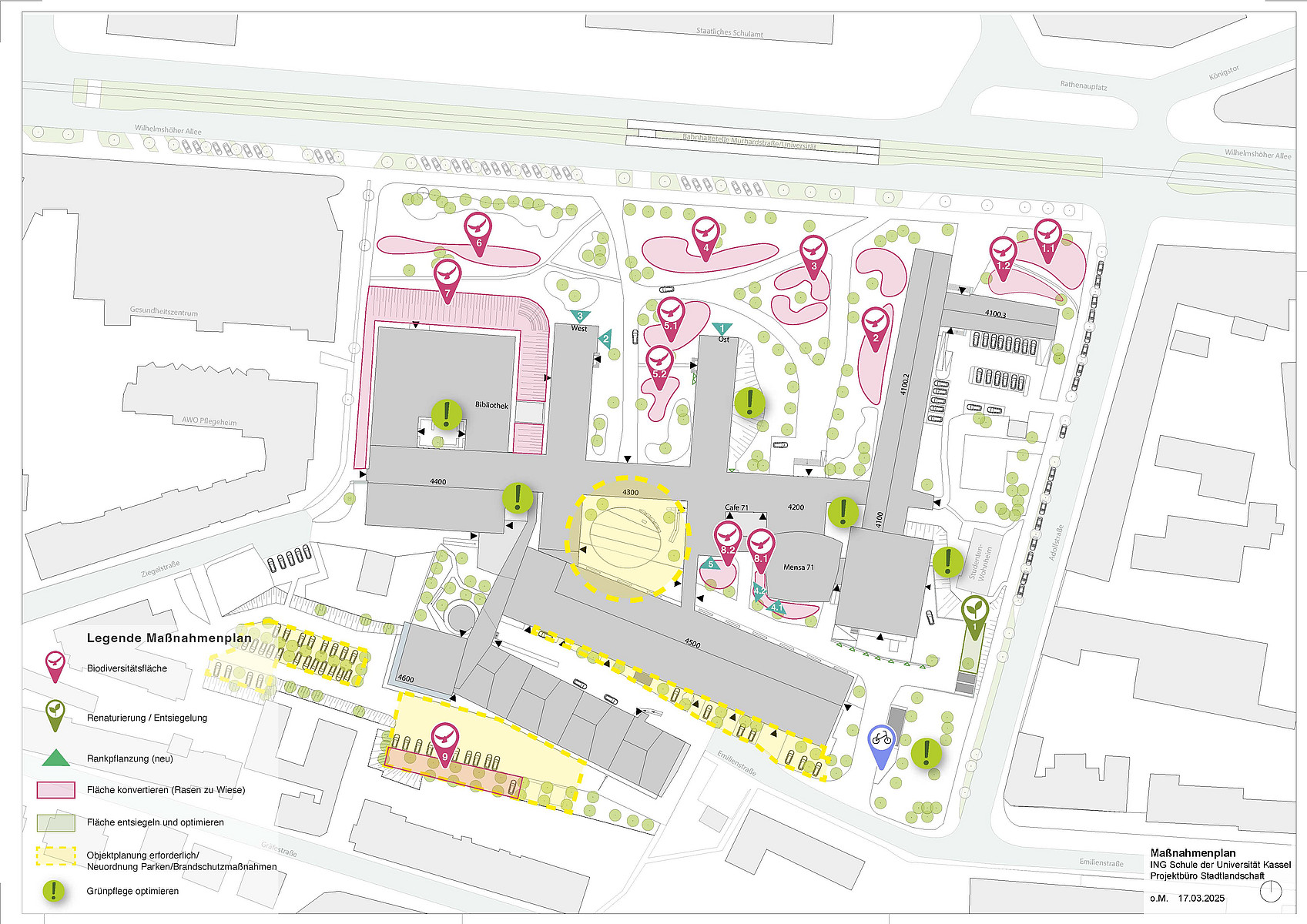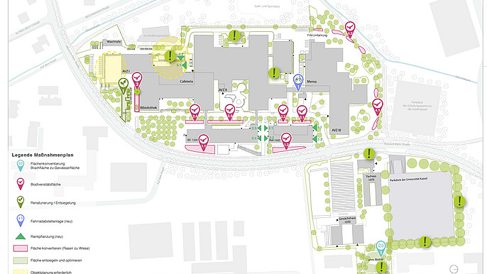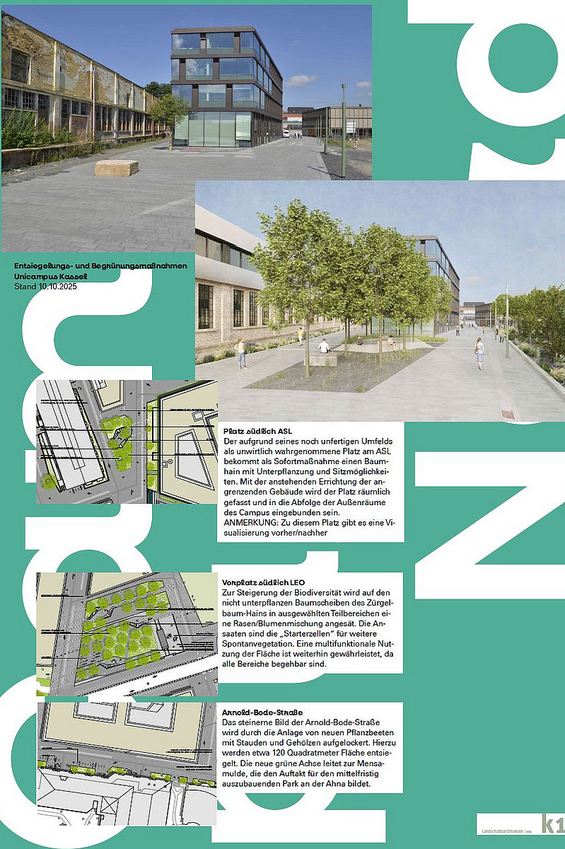 Im Entwicklungsplan 2025–2029 setzt die Universität Kassel auf zukunftsorientierte Freiraumplanung: Neue Leitlinien und konkrete Maßnahmen sollen Biodiversität steigern, Mikroklima verbessern und die Aufenthaltsqualität erhöhen. Geplant sind Entsiegelungen, klimaresiliente Fassaden- und Dachbegrünungen sowie mehr Artenvielfalt auf befestigten Flächen, etwa durch Blumen-Schotter-Rasen. Bestehende Außenanlagen am Campus Nord werden mit durchlässigen Belägen, Grünflächen, Bäumen, Pflanzstreifen und Wandbegrünungen optimiert. Die Leitlinien bilden künftig die Grundlage aller Projekte und rücken ökologische und klimaökologische Aspekte in den Fokus.