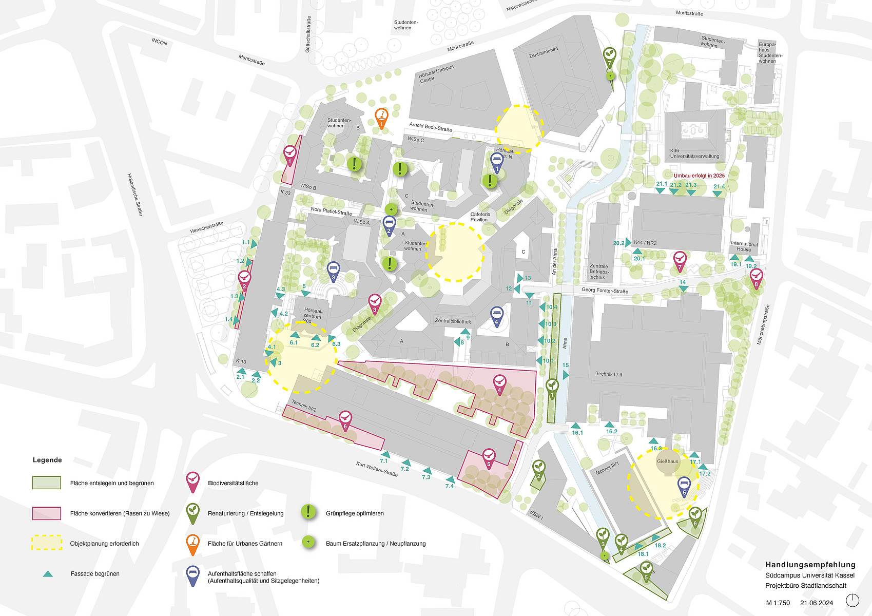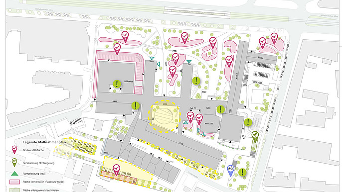 Für den Standort wurden 21 Maßnahmen zur Flächenentsiegelung, -begrünung (1), Biodiversitätsfläche (9), Grünpflege optimieren (6) sowie Fassadenbegrünung (5) entwickelt.
