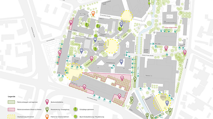 Es wurden 41 Maßnahmen identifiziert: 7 zur Entsiegelung und Begrünung, 8 Biodiversitätsflächen, 5 Aufenthaltsflächen und 21 Möglichkeiten zu Fassadenbegrünungen.