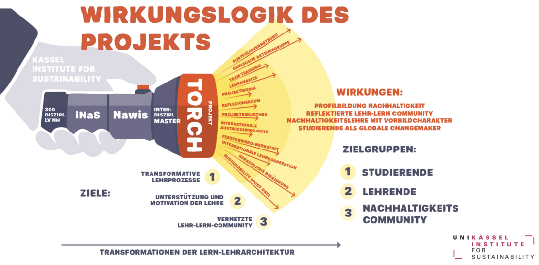 TORCH zielt darauf ab, Nachhaltigkeit als transformativen Profilschwerpunkt der Universität Kassel im Lehrangebot erfahrbar zu machen. Studierende und Lehrende sollen sich als „Changemaker“ verstehen, die ihr Wissen in gesellschaftliche Prozesse einbringen. Das Projekt besitzt durch seine Breite und Tiefe Modellcharakter für andere Hochschulen. Zur Qualitätssicherung wird ein zweistufiges Wirkungsmonitoring umgesetzt: interne Evaluationen (z. B. Lehrevaluation, Studienverlaufsanalysen) sowie externe Verfahren (z. B. SWOT-Analysen, partizipative Formate). Die Laufzeit des Projekts umfasst zwei Phasen: von Oktober 2025 bis Ende 2029 (Phase I) sowie von Januar 2030 bis September 2031 (Phase II).