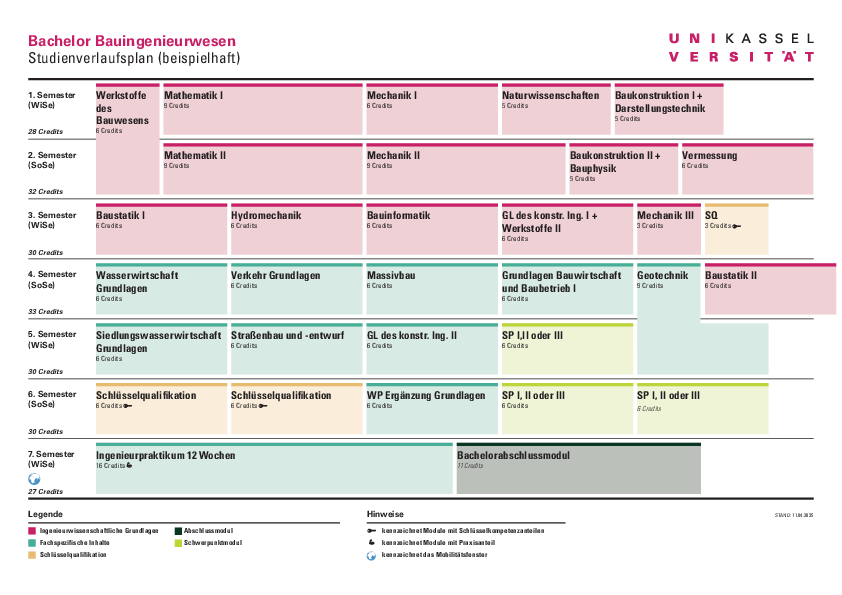 Ziel des siebensemestrigen Bachelor-Studiengangs an der Uni Kassel ist eine generalistische, auf die Praxis bezogene und wissenschaftlich orientierte Ausbildung. In den ersten Semestern werden ingenieurwissenschaftliche Grundlagen in Mathematik und Mechanik, in naturwissenschaftlichen Fächern, in der EDV-Anwendung und im Bauingenieurwesen gelehrt. Die Studierenden können danach Schwerpunkte setzen und zwischen sieben Studienrichtungen wählen: Baubetrieb und Baumanagement, Konstruktiver Ingenieurbau, Verkehr, Wasser, Numerische Methoden der Tragwerksanalyse, Straßenbau und Werkstoffe.