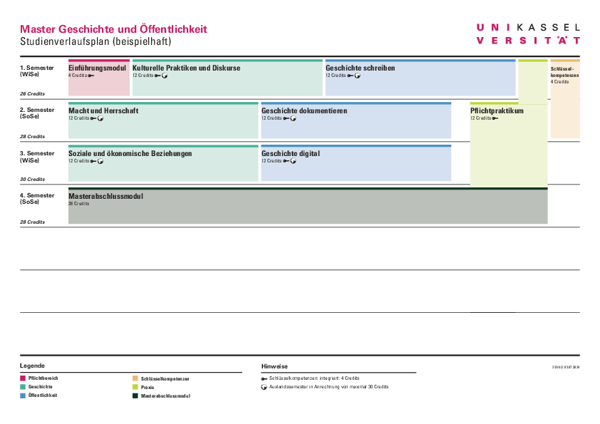 Die im Master „Geschichte und Öffentlichkeit“ zu erbringenden Studienleistungen können „klassisch“ aus einem Referat, einer Diskussionsleitung, der Moderation einer Seminarsitzung oder Vortragsveranstaltung, der Organisation einer Podiumsdiskussion, einer Vortragsveranstaltung, eines wissenschaftlichen Workshops, eines Exkursionsprogramms, Teilnahme an studentischen Projekten, Fragebogenentwicklung, Interviews, Veranstaltungskonzeption, Gruppenleitung, u.Ä. bestehen. Sie können aber auch neue audiovisuelle und digitale Formate wie Podcasts, Poster oder Blogs umfassen. Dasselbe gilt für die Prüfungsleistungen. Hier kommen klassische Leistungsabfragen wie Hausarbeiten ebenso zum Tragen, wie kreative, praxisorientierte Übungsformen wie Essays, Ausstellungskataloge oder Veranstaltung- und Projektkonzepte.