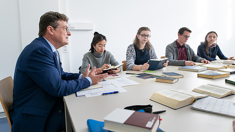 Imagebild einer Lehr- und Arbeitssituation. Es sind vier Studierende abgebildet, die gemeinsam mit dem Dozenten an zusammengestellten Tischen in einem Seminarraum sitzen. Der Dozent spricht und die Studierenden schauen in die vor ihnen aufgeschlagenen Bücher. Auf den Tischen liegen weitere Bücher und Arbeitsmaterialien. Bild: Paavo Blafield