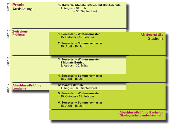 Nach Abschluss der Ausbildungszeit schreiben Sie sich wieder als Student:in in den Bachelorstudiengang Ökologische Landwirtschaft ein und führen Ihr Studium fort. Die Ausbildungsdauer und die Note der Abschlussprüfung wird auf das Berufliche Praktikum im Bachelorstudiengang angerechnet.