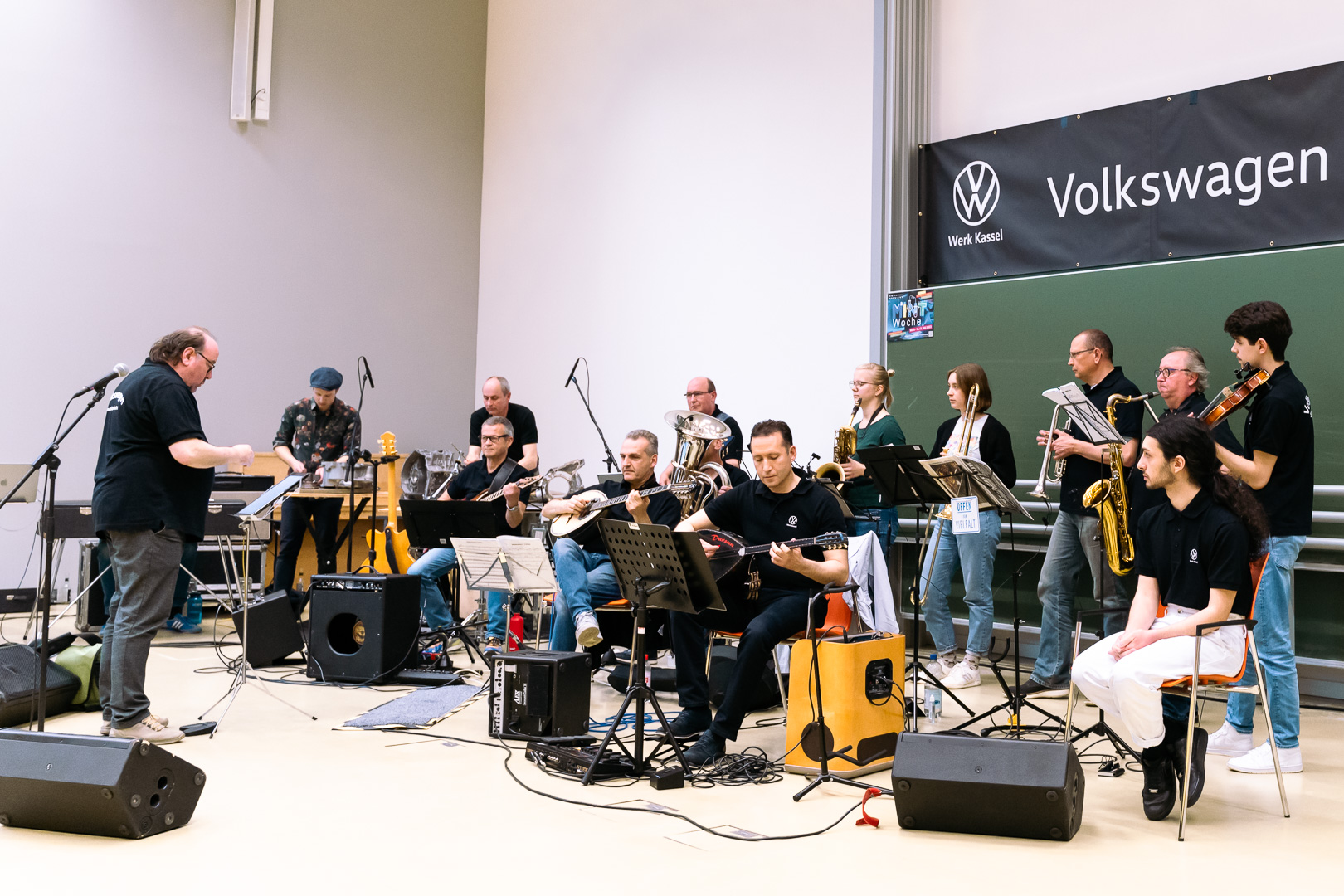 Die Band Volkswagen-Soundorchestra wurde 2018 gegründet und besteht aus Musiker:innen, die VW-Mitarbeiter:innen aus ganz unterschiedlichen Bereichen sind. Sie interpretieren die von Detlef Landeck komponierten Module und lassen im Rahmen des „Conducted Improvisation Concepts“ ihrem kreativen Improvisationsvermögen freien Lauf. Percussion-Grooves, die VW-Fahrzeugbauteilen entlockt werden, sind ebenso Teil des Volkswagen-Soundorchestra wie Maschinen-Sounds aus den Produktionshallen von Volkswagen-Kassel.